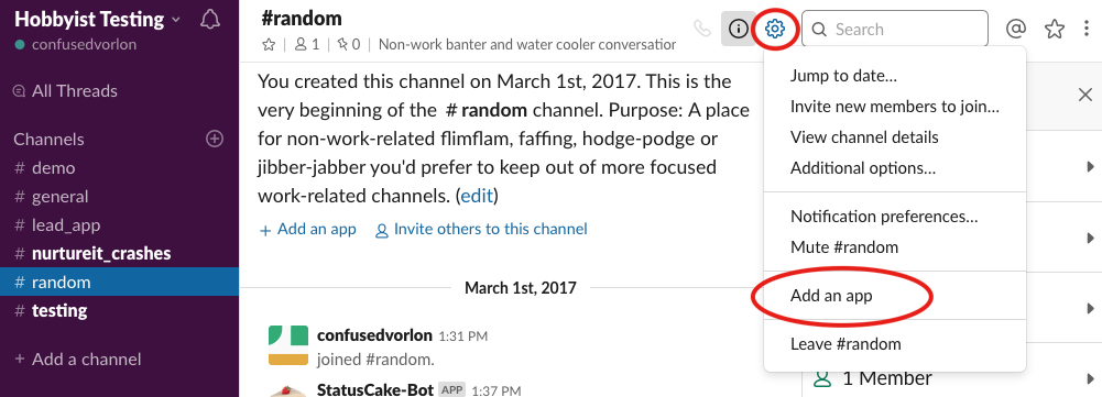 - Open any slack channel and click on the settings (cog) icon at the top right